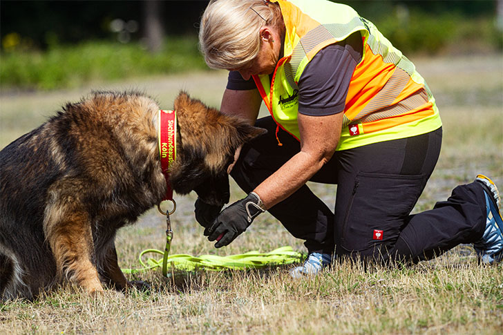 Die Suche beginnt an der Stelle, an der die gesuchte Person zum letzten Mal gesehen wurde. Von dort aus arbeitet der Hund den Individualgeruch von alt nach neu ab.